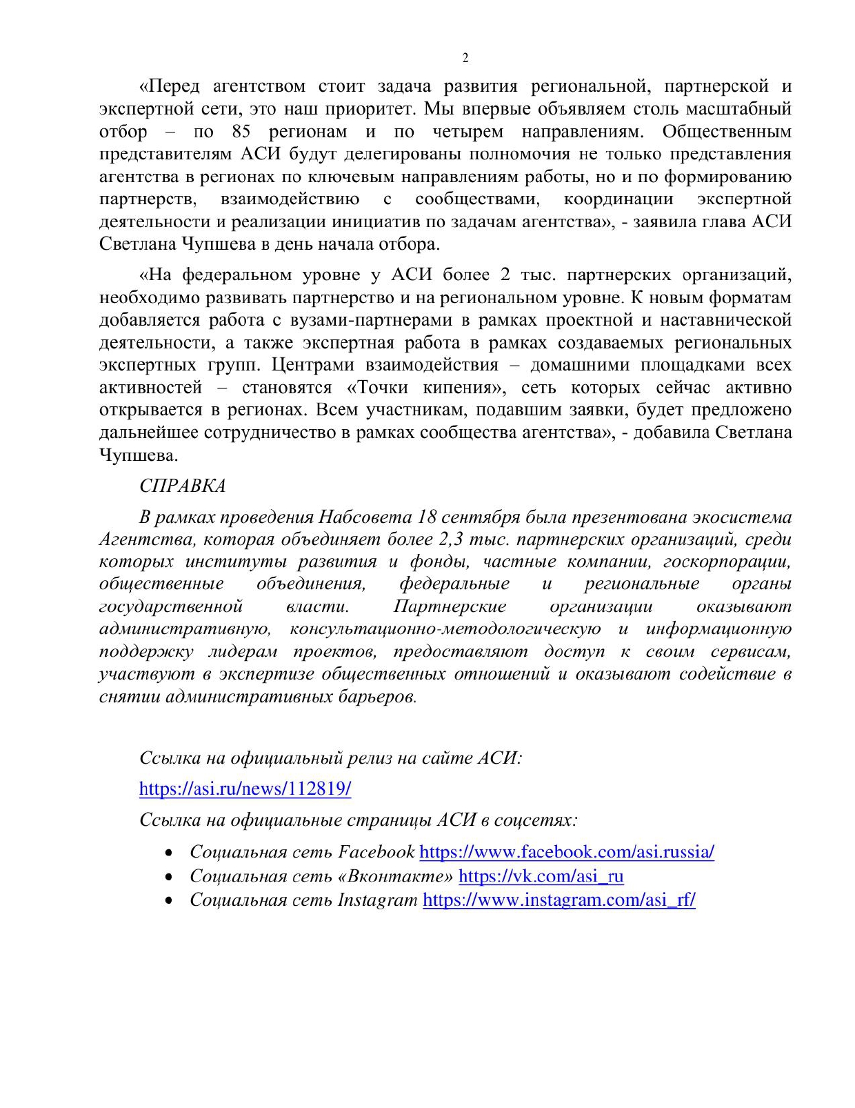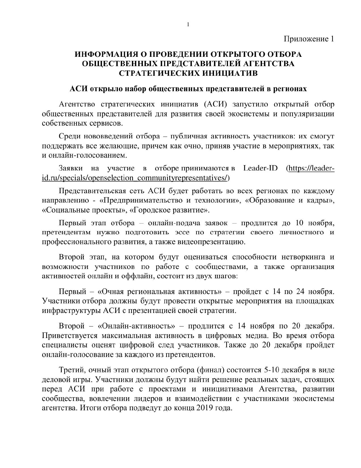 Автономная некоммерческая организация «Агентство стратегических инициатив по продвижению новых проектов» (Далее – Агентство) с 9 октября 2019 года проводит открытый отбор общественных представителей Агентства в регионах. Общественные представители отбираются по направлениям «Предпринимательство и технологии», «Образование и кадры2, «Социальные проекты», «Городское развитие». Подробная информация об открытом отборе размещена на официальном сайте Агентства asi.ru.
