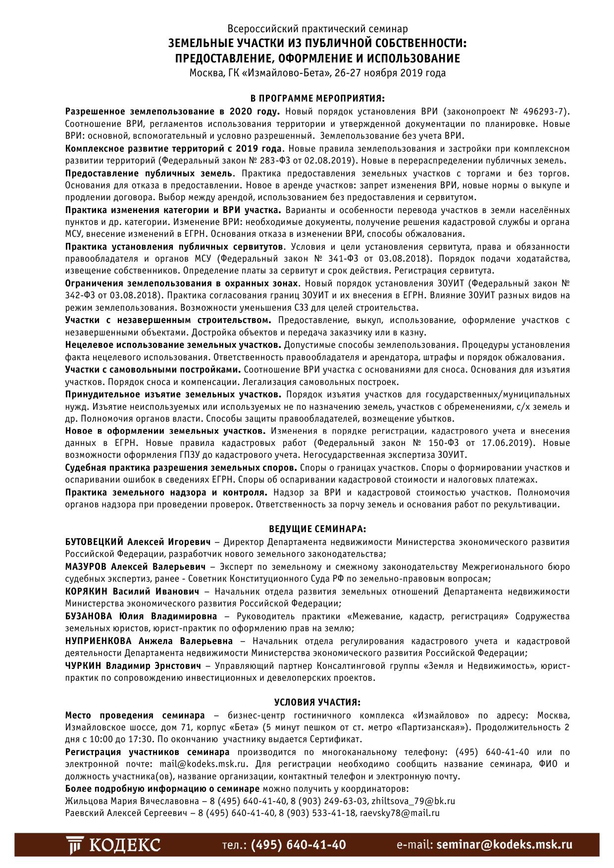 26-27 ноября Консультационный центр «Кодекс» организует в г. Москва Всероссийский практический семинар «Земельные участки из публичной собственности: предоставление, оформление и использование».