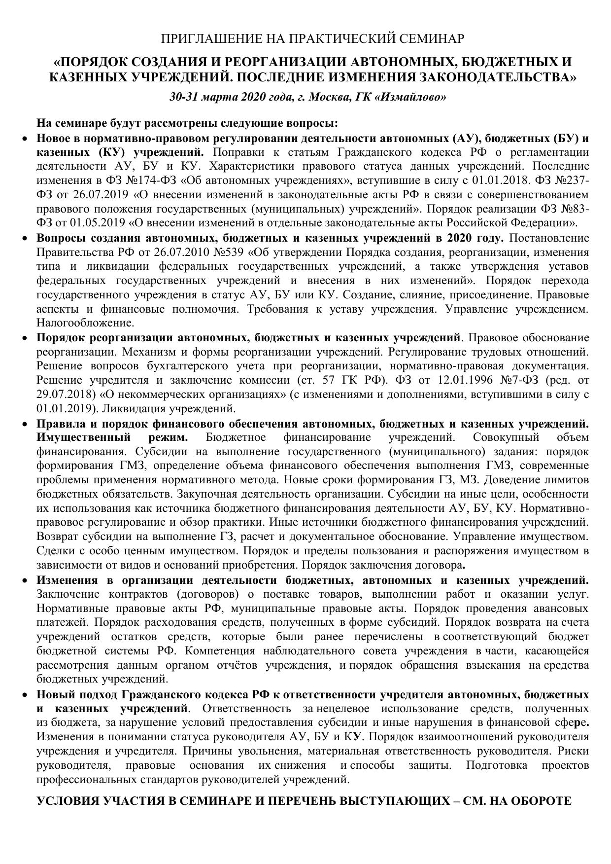 30—31 марта в г. Москве состоится практический семинар «Порядок создания и реорганизация автономных, бюджетных и казенных учреждений. Последние изменения в законодательстве».
