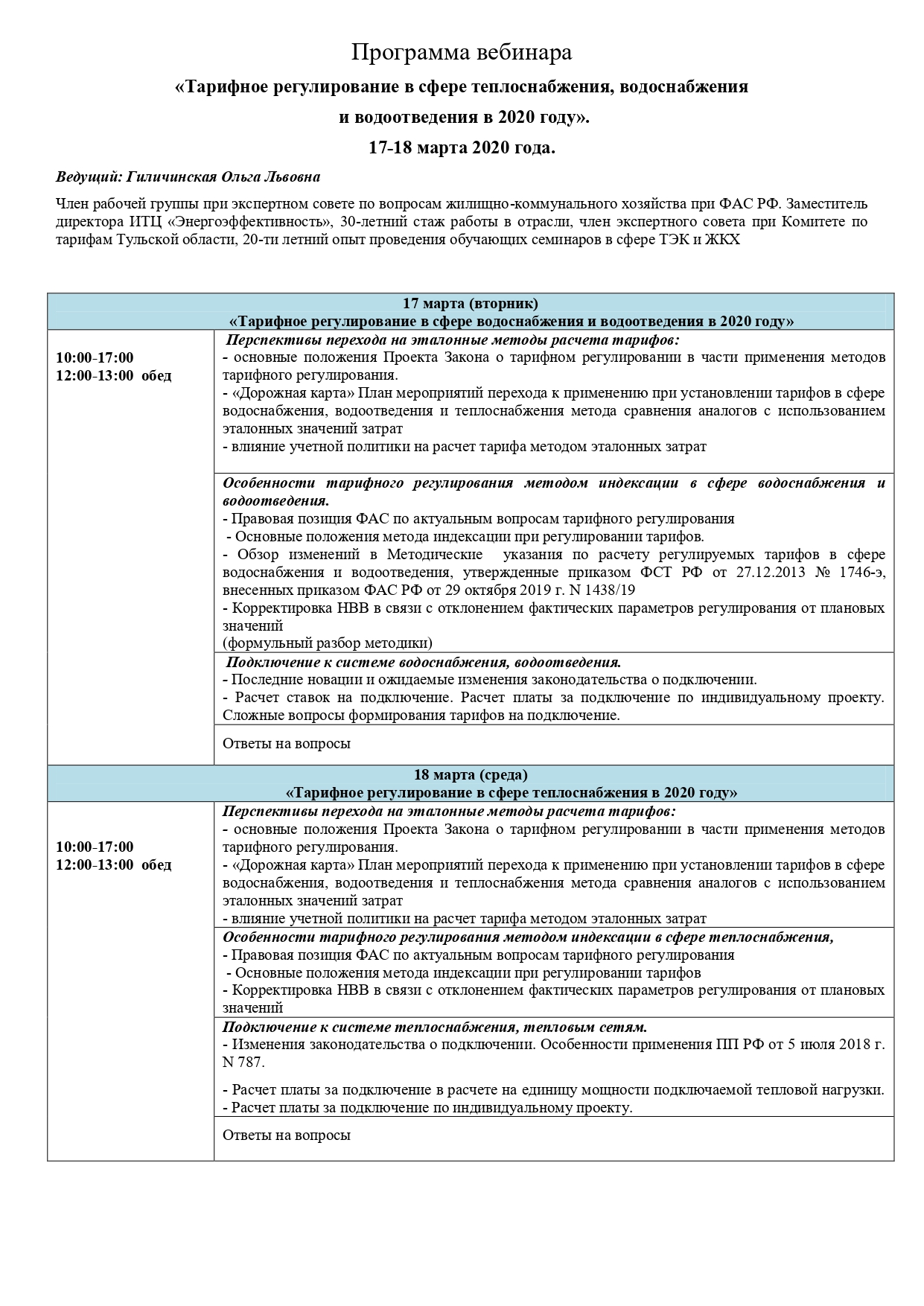 С 17 по 18 марта 2020 года состоится Всероссийский практический вебинар «Тарифное регулирование в сфере теплоснабжения, водоснабжения и водоотведения в 2020 году».