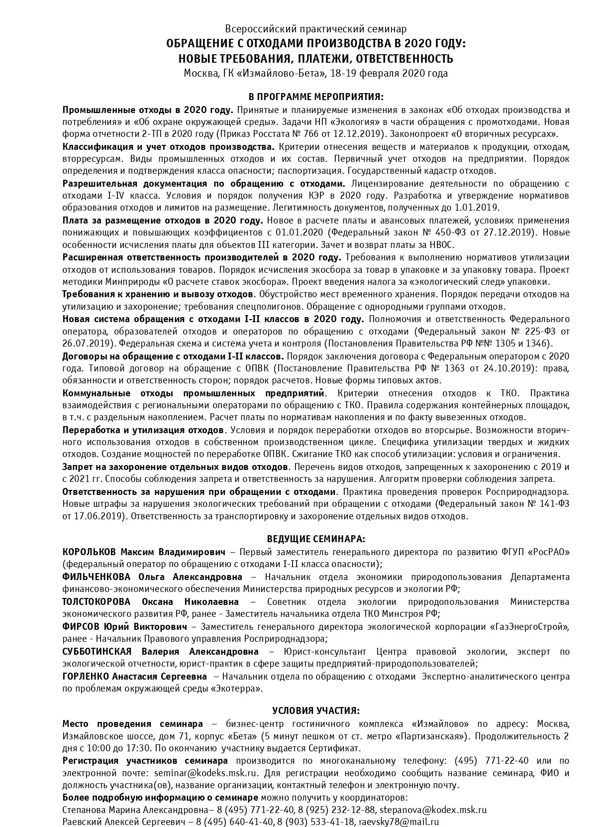 С 18 по 19 февраля 2020 года в Москве состоится Всероссийский практический семинар: «Обращение с отходами производства в 2020 году: новые требования, платежи, ответственность».