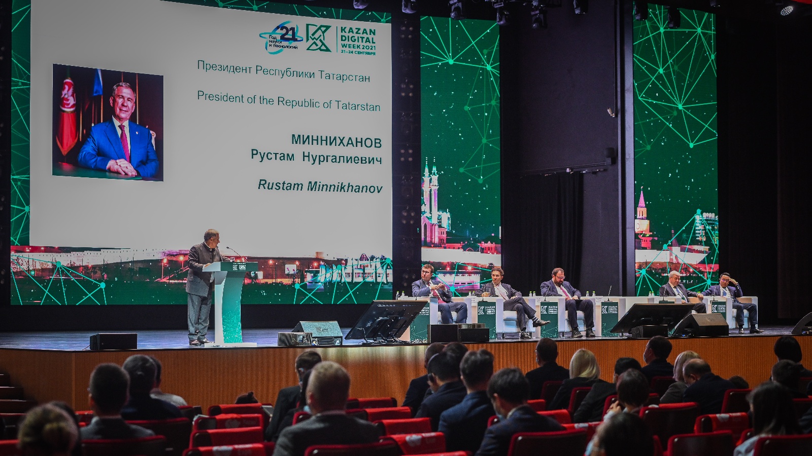 Сегодня состоялось открытие международного форума Kazan Digital Week 2021. В мероприятии приняли участие Президент Татарстана Рустам Минниханов, министр цифрового развития, связи и массовых коммуникаций РФ Максут Шадаев, председатель Совета муниципальных образований РТ Экзам Губайдуллин и другие.