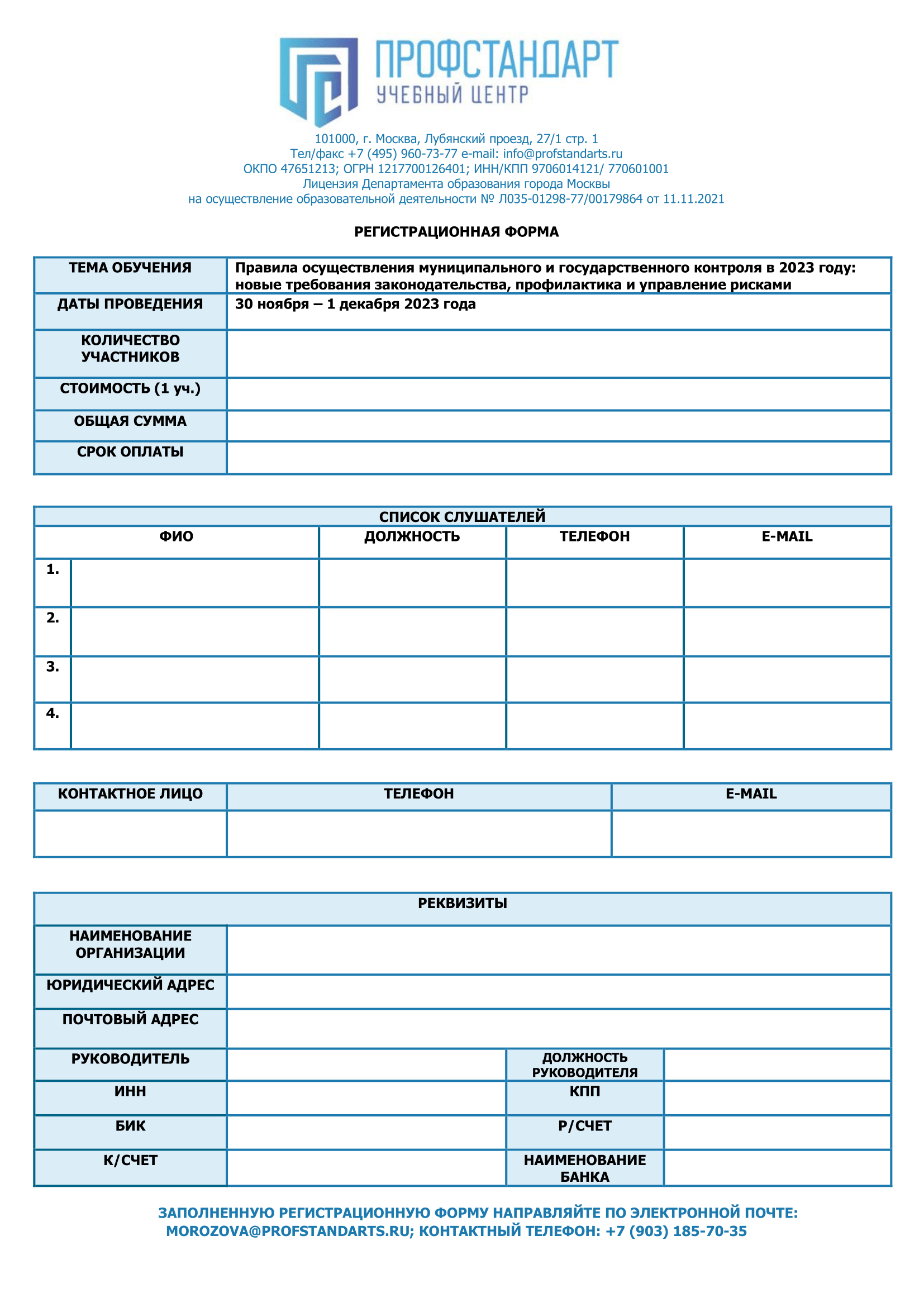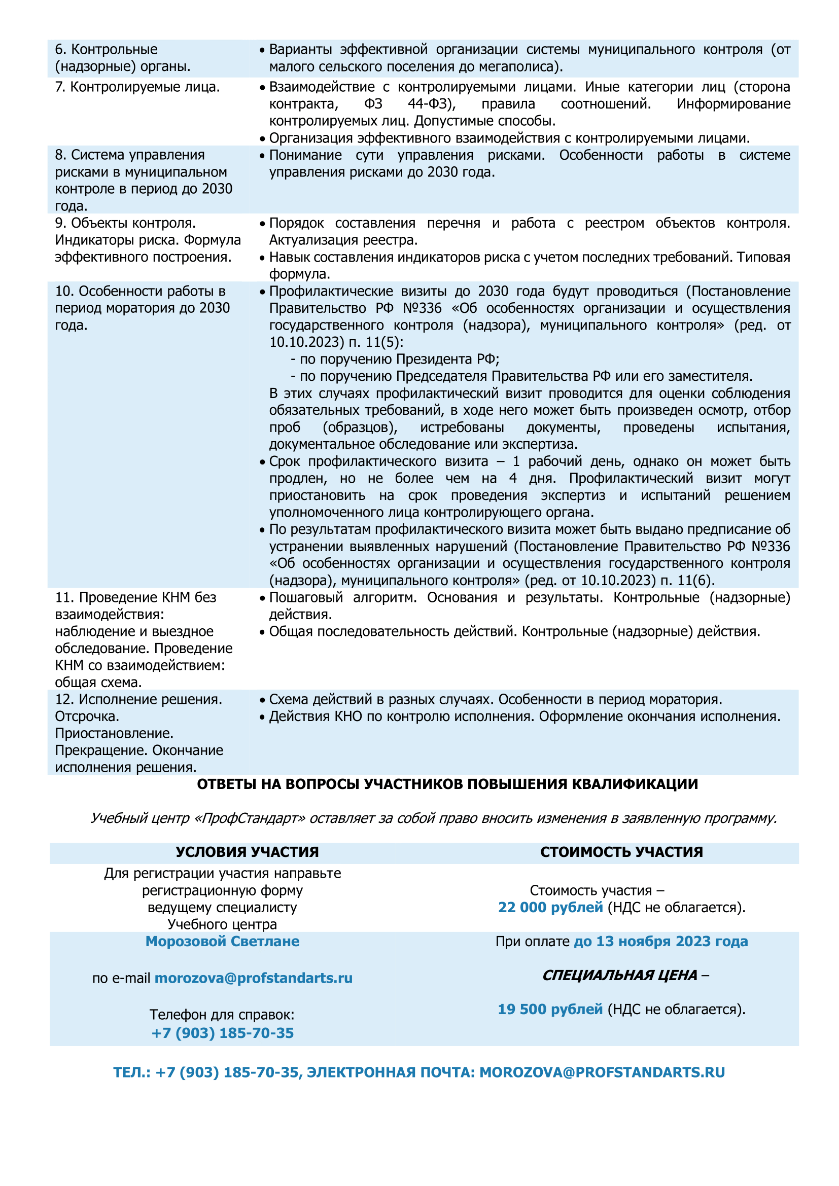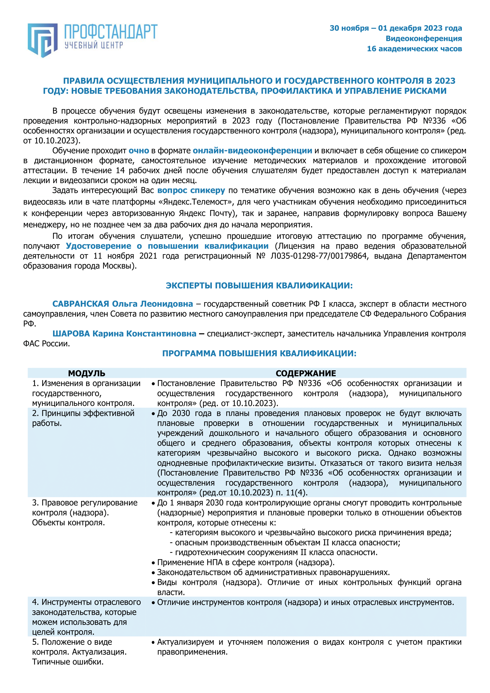 С 30 ноября по 1 декабря 2023 года состоится повышение квалификации по теме «Правила осуществления муниципального и государственного контроля в 2023 году: новые требования законодательства, профилактика и управление рисками». Организатор обучения – учебный центр «ПрофСтандарт».